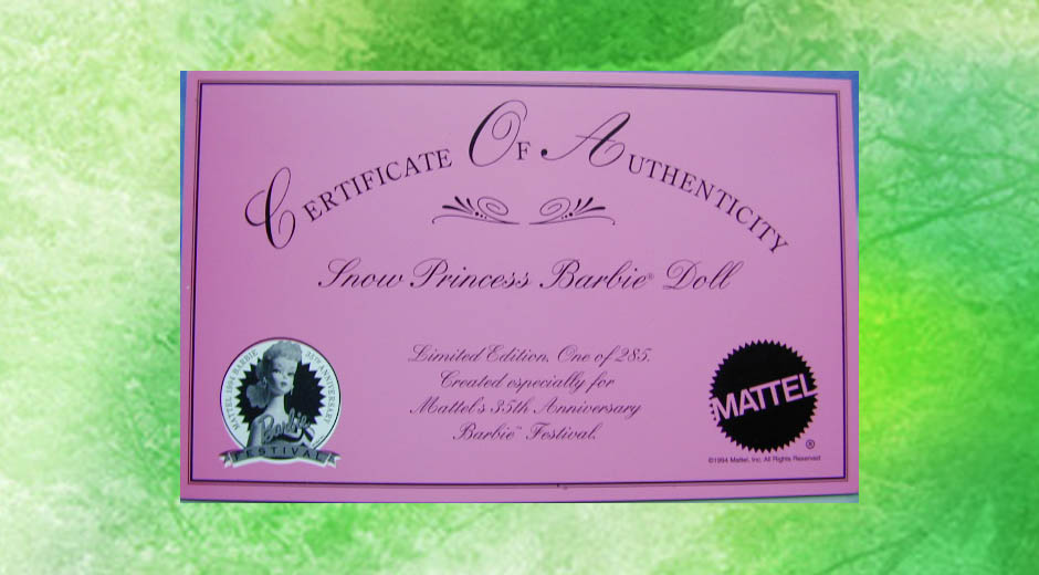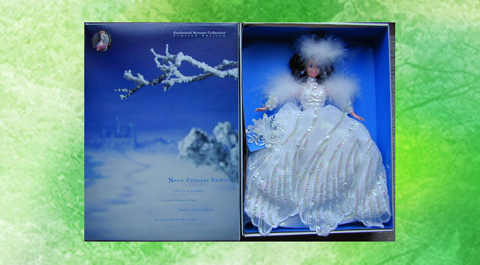 バービー誕生35周年を記念して発売された「Festival 1994」シリーズの「Snow Princess Brunette」で、285体限定で販売されました。ブロンドの「Snow Princess」のブルネットバージョンです。